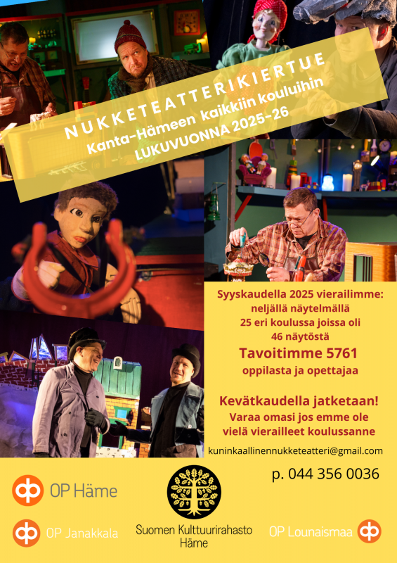 Kuninkaallisen Nukketeatterin koulukiertue kaikkiin Kanta-Hämeen kouluihin lukuvuonna 2025-26 jatkuu taas kevätkaudella. Esityspäiviä on vielä hyvin keväälle tarjolla jos koulunne ei ole vielä ilmoittautunut mukaan. Näytökset kouluihin tarjolla edulliseen subventoituun hintaan. Kiertueen päärahoittajana Suomen Kulttuurirahaston Hämeen Rahasto. Syyskaudella esityksiä oli kouluissa yli 50 saavuttaen niissä yli 5000 katsojaa.