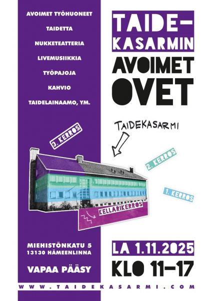 Hämeenlinnan Taidekasarmi viettää jälleen avoimien ovien päivää la 02.11.24. Kasarmilla työskentelee lukuisia eri alan ammattitaiteilijoita joiden työ..